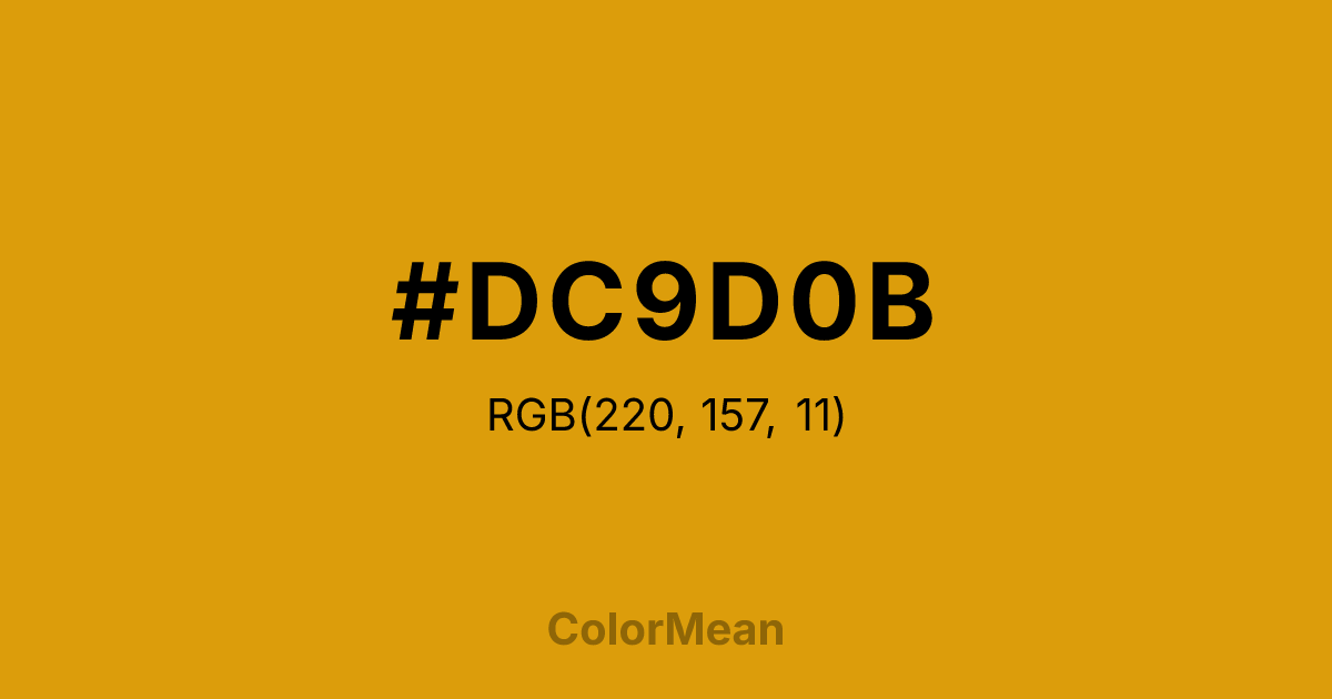 #DC9D0B RGB value is (220, 157, 11). The hex color red value is 220, green is 157, and blue is 11. Its HSL format shows a hue of 42°, saturation of 90 percent, and lightness of 45 percent. The CMYK process values are 0 percent, 29 percent, 95 percent, 14 percent.