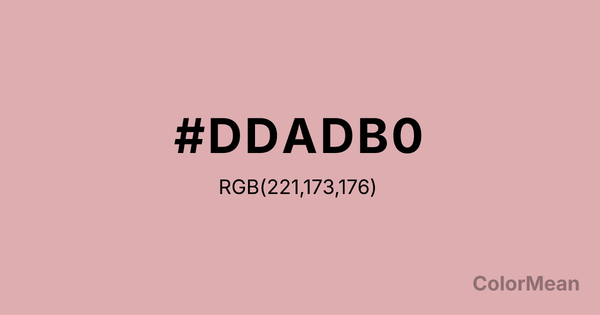 #DDADB0 RGB value is (221, 173, 176). The hex color red value is 221, green is 173, and blue is 176. Its HSL format shows a hue of 356°, saturation of 41 percent, and lightness of 77 percent. The CMYK process values are 0 percent, 22 percent, 20 percent, 13 percent.