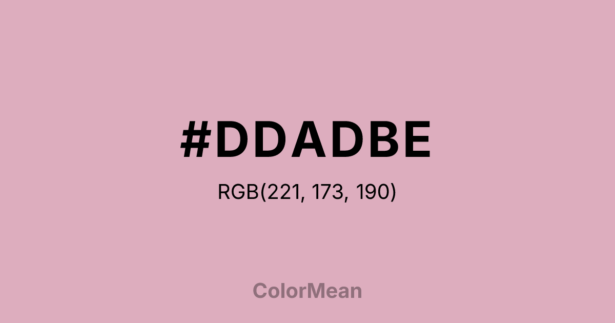 #DDADBE RGB value is (221, 173, 190). The hex color red value is 221, green is 173, and blue is 190. Its HSL format shows a hue of 339°, saturation of 41 percent, and lightness of 77 percent. The CMYK process values are 0 percent, 22 percent, 14 percent, 13 percent.