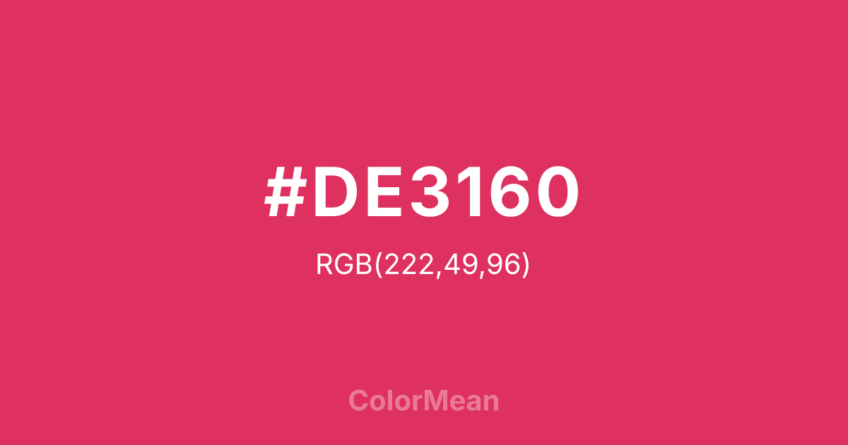 #DE3160 RGB value is (222, 49, 96). The hex color red value is 222, green is 49, and blue is 96. Its HSL format shows a hue of 344°, saturation of 72 percent, and lightness of 53 percent. The CMYK process values are 0 percent, 78 percent, 57 percent, 13 percent.