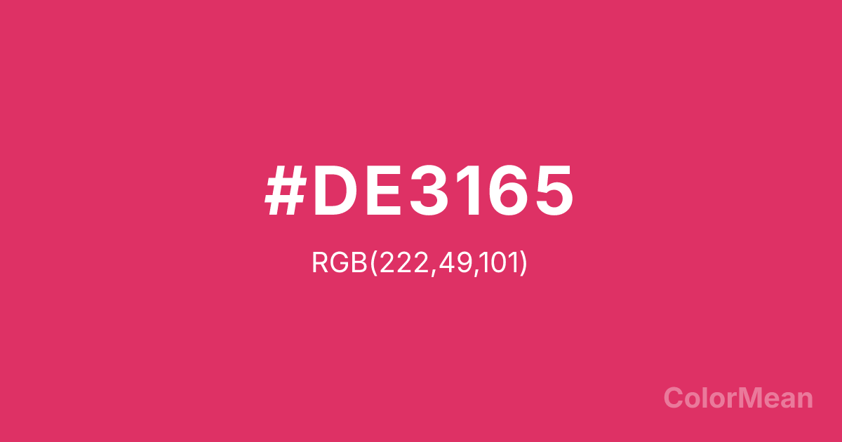 #DE3165 RGB value is (222, 49, 101). The hex color red value is 222, green is 49, and blue is 101. Its HSL format shows a hue of 342°, saturation of 72 percent, and lightness of 53 percent. The CMYK process values are 0 percent, 78 percent, 55 percent, 13 percent.
