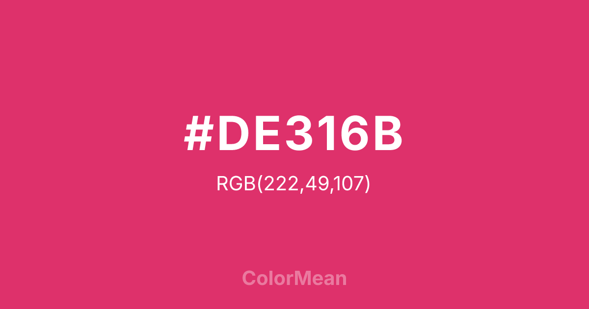 #DE316B RGB value is (222, 49, 107). The hex color red value is 222, green is 49, and blue is 107. Its HSL format shows a hue of 340°, saturation of 72 percent, and lightness of 53 percent. The CMYK process values are 0 percent, 78 percent, 52 percent, 13 percent.