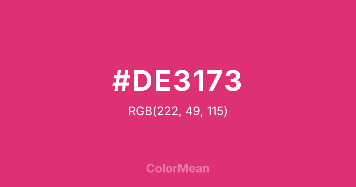 #DE3173 RGB value is (222, 49, 115). The hex color red value is 222, green is 49, and blue is 115. Its HSL format shows a hue of 337°, saturation of 72 percent, and lightness of 53 percent. The CMYK process values are 0 percent, 78 percent, 48 percent, 13 percent.