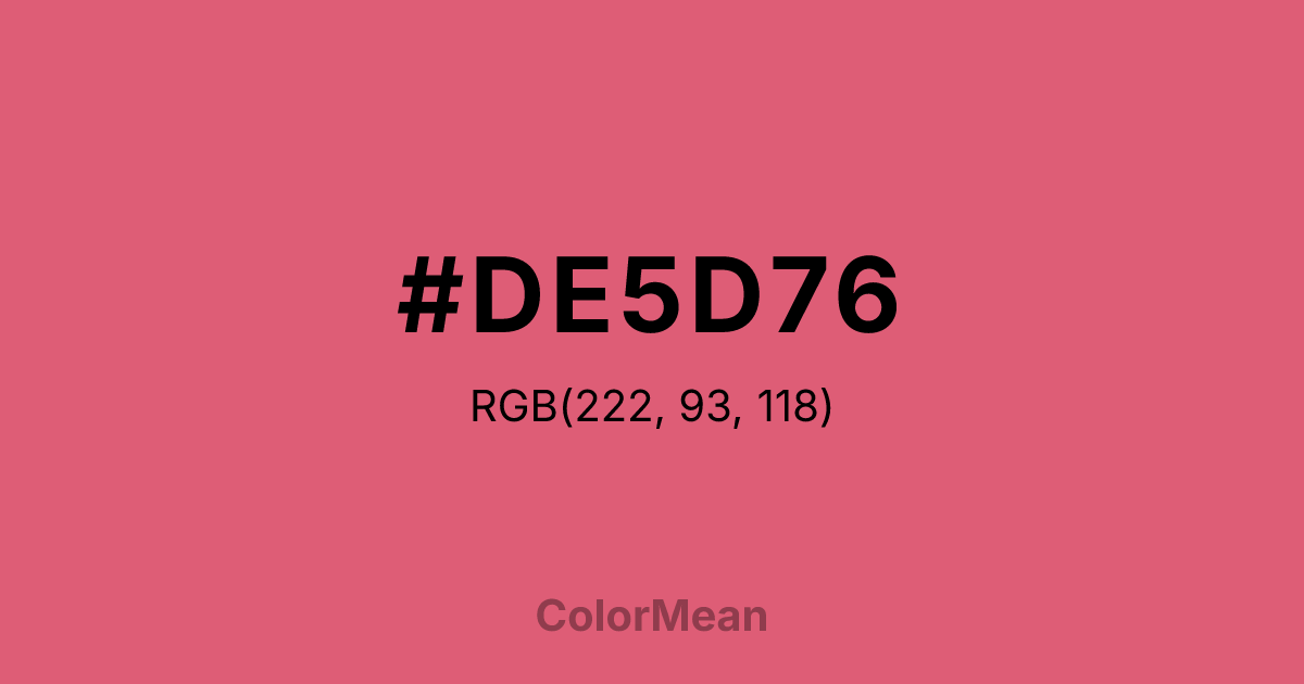 #DE5D76 RGB value is (222, 93, 118). The hex color red value is 222, green is 93, and blue is 118. Its HSL format shows a hue of 348°, saturation of 66 percent, and lightness of 62 percent. The CMYK process values are 0 percent, 58 percent, 47 percent, 13 percent.