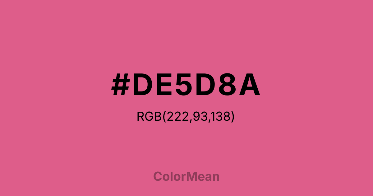 #DE5D8A RGB value is (222, 93, 138). The hex color red value is 222, green is 93, and blue is 138. Its HSL format shows a hue of 339°, saturation of 66 percent, and lightness of 62 percent. The CMYK process values are 0 percent, 58 percent, 38 percent, 13 percent.