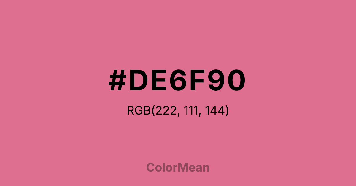 #DE6F90 RGB value is (222, 111, 144). The hex color red value is 222, green is 111, and blue is 144. Its HSL format shows a hue of 342°, saturation of 63 percent, and lightness of 65 percent. The CMYK process values are 0 percent, 50 percent, 35 percent, 13 percent.