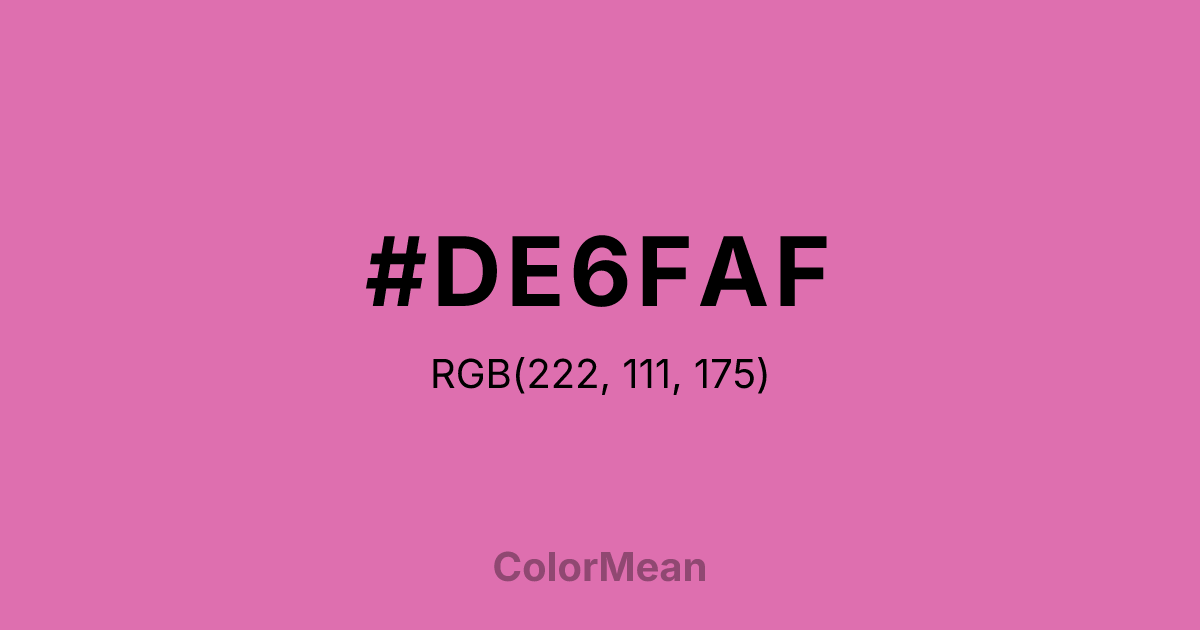 #DE6FAF RGB value is (222, 111, 175). The hex color red value is 222, green is 111, and blue is 175. Its HSL format shows a hue of 325°, saturation of 63 percent, and lightness of 65 percent. The CMYK process values are 0 percent, 50 percent, 21 percent, 13 percent.