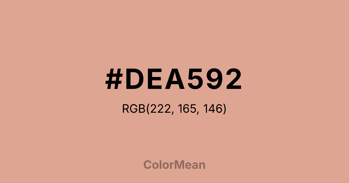 #DEA592 RGB value is (222, 165, 146). The hex color red value is 222, green is 165, and blue is 146. Its HSL format shows a hue of 15°, saturation of 54 percent, and lightness of 72 percent. The CMYK process values are 0 percent, 26 percent, 34 percent, 13 percent.