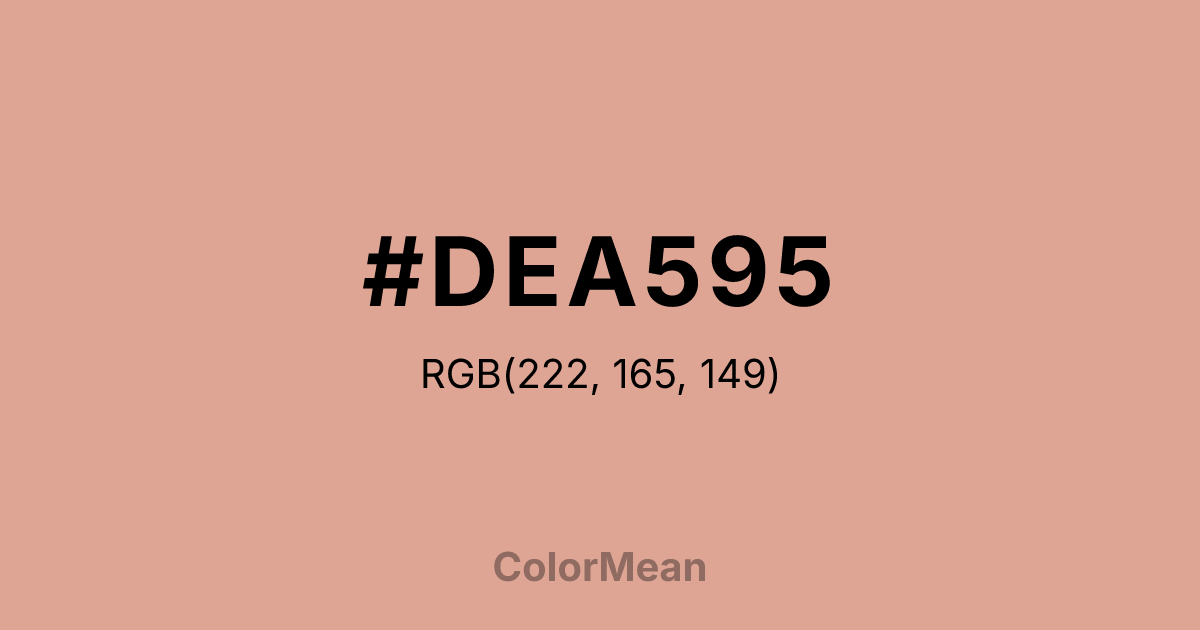 #DEA595 RGB value is (222, 165, 149). The hex color red value is 222, green is 165, and blue is 149. Its HSL format shows a hue of 13°, saturation of 53 percent, and lightness of 73 percent. The CMYK process values are 0 percent, 26 percent, 33 percent, 13 percent.