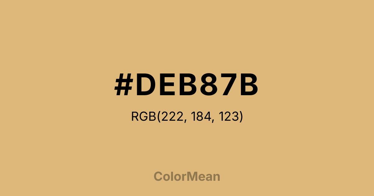 #DEB87B RGB value is (222, 184, 123). The hex color red value is 222, green is 184, and blue is 123. Its HSL format shows a hue of 37°, saturation of 60 percent, and lightness of 68 percent. The CMYK process values are 0 percent, 17 percent, 45 percent, 13 percent.