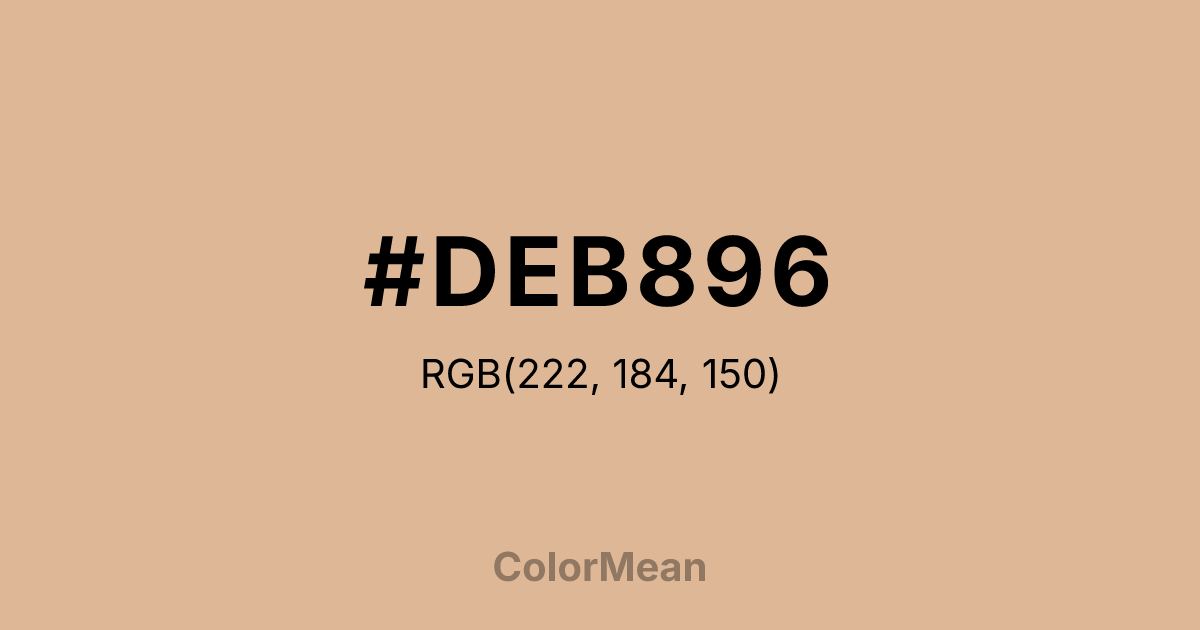#DEB896 RGB value is (222, 184, 150). The hex color red value is 222, green is 184, and blue is 150. Its HSL format shows a hue of 28°, saturation of 52 percent, and lightness of 73 percent. The CMYK process values are 0 percent, 17 percent, 32 percent, 13 percent.