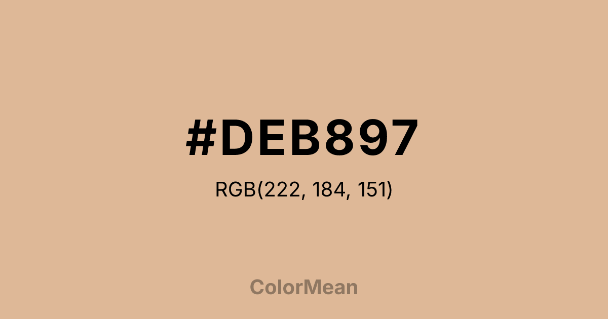 #DEB897 RGB value is (222, 184, 151). The hex color red value is 222, green is 184, and blue is 151. Its HSL format shows a hue of 28°, saturation of 52 percent, and lightness of 73 percent. The CMYK process values are 0 percent, 17 percent, 32 percent, 13 percent.