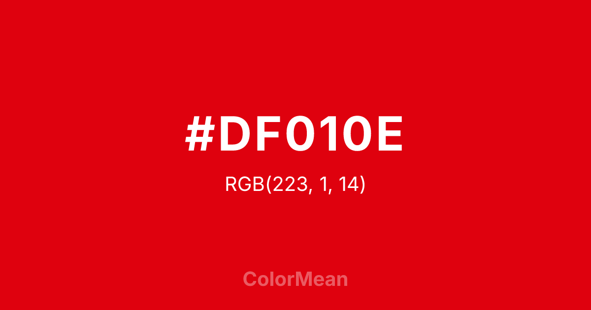 #DF010E RGB value is (223, 1, 14). The hex color red value is 223, green is 1, and blue is 14. Its HSL format shows a hue of 356°, saturation of 99 percent, and lightness of 44 percent. The CMYK process values are 0 percent, 100 percent, 94 percent, 13 percent.