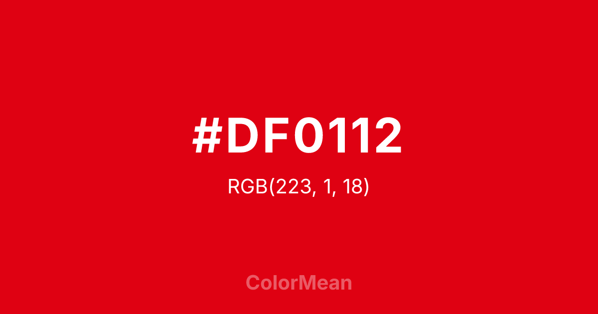 #DF0112 RGB value is (223, 1, 18). The hex color red value is 223, green is 1, and blue is 18. Its HSL format shows a hue of 355°, saturation of 99 percent, and lightness of 44 percent. The CMYK process values are 0 percent, 100 percent, 92 percent, 13 percent.