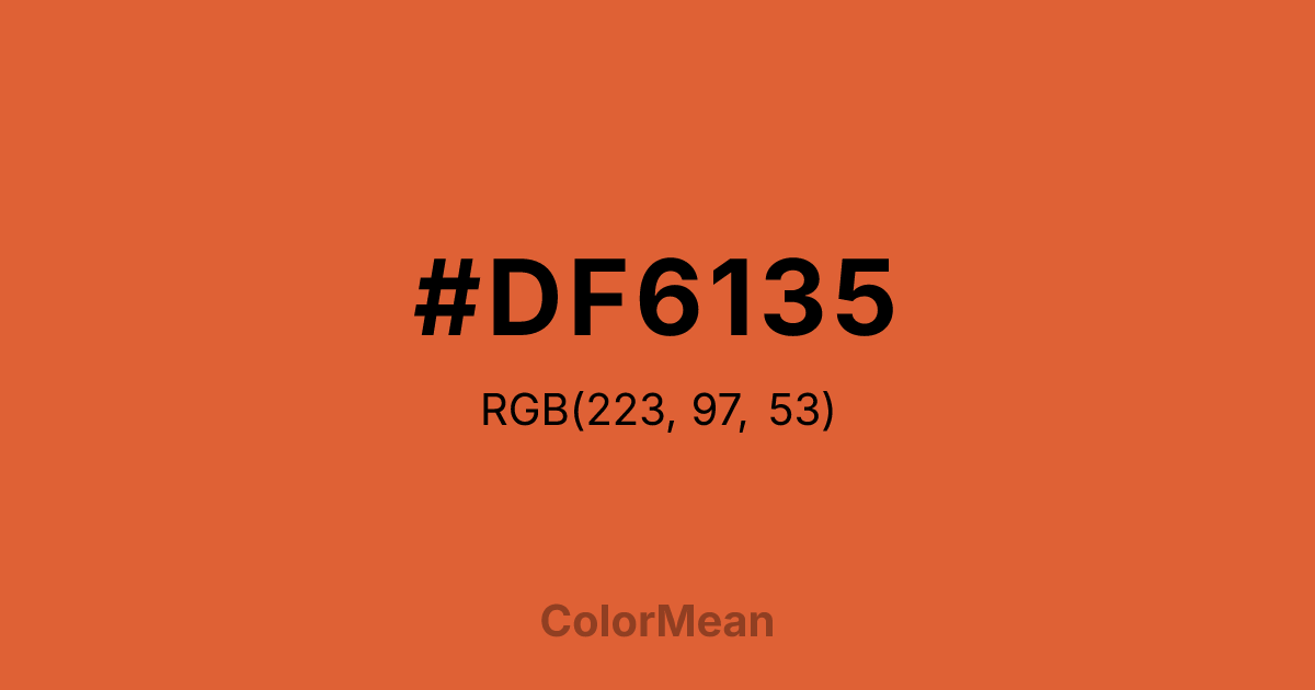 #DF6135 RGB value is (223, 97, 53). The hex color red value is 223, green is 97, and blue is 53. Its HSL format shows a hue of 16°, saturation of 73 percent, and lightness of 54 percent. The CMYK process values are 0 percent, 57 percent, 76 percent, 13 percent.