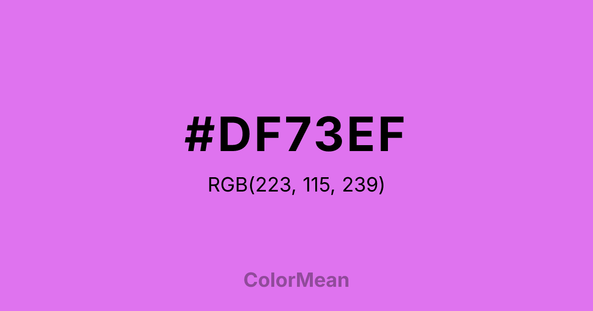 #DF73EF RGB value is (223, 115, 239). The hex color red value is 223, green is 115, and blue is 239. Its HSL format shows a hue of 292°, saturation of 79 percent, and lightness of 69 percent. The CMYK process values are 7 percent, 52 percent, 0 percent, 6 percent.