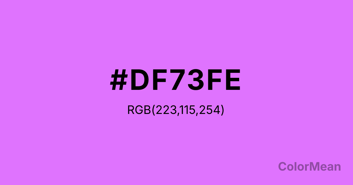 #DF73FE RGB value is (223, 115, 254). The hex color red value is 223, green is 115, and blue is 254. Its HSL format shows a hue of 287°, saturation of 99 percent, and lightness of 72 percent. The CMYK process values are 12 percent, 55 percent, 0 percent, 0 percent.