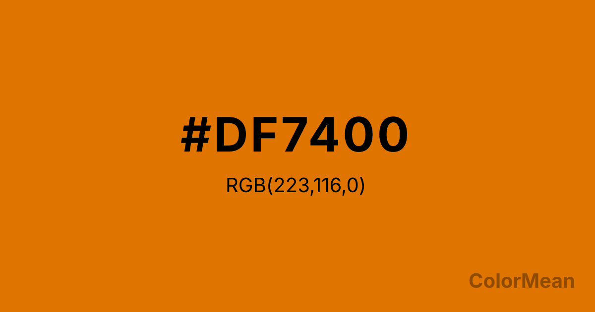 #DF7400 RGB value is (223, 116, 0). The hex color red value is 223, green is 116, and blue is 0. Its HSL format shows a hue of 31°, saturation of 100 percent, and lightness of 44 percent. The CMYK process values are 0 percent, 48 percent, 100 percent, 13 percent.