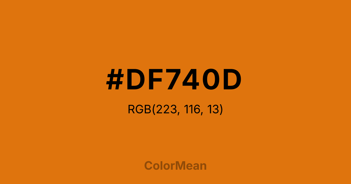 #DF740D RGB value is (223, 116, 13). The hex color red value is 223, green is 116, and blue is 13. Its HSL format shows a hue of 29°, saturation of 89 percent, and lightness of 46 percent. The CMYK process values are 0 percent, 48 percent, 94 percent, 13 percent.