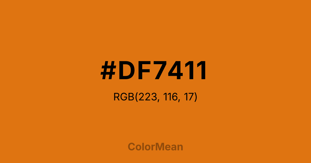 #DF7411 RGB value is (223, 116, 17). The hex color red value is 223, green is 116, and blue is 17. Its HSL format shows a hue of 29°, saturation of 86 percent, and lightness of 47 percent. The CMYK process values are 0 percent, 48 percent, 92 percent, 13 percent.