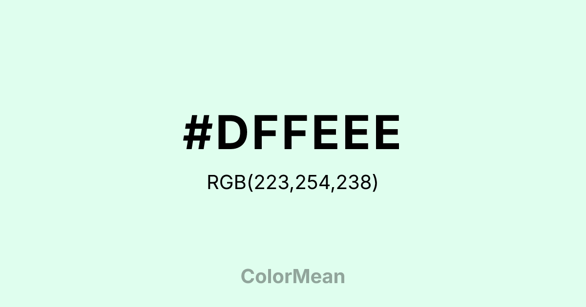 #DFFEEE RGB value is (223, 254, 238). The hex color red value is 223, green is 254, and blue is 238. Its HSL format shows a hue of 149°, saturation of 94 percent, and lightness of 94 percent. The CMYK process values are 12 percent, 0 percent, 6 percent, 0 percent.