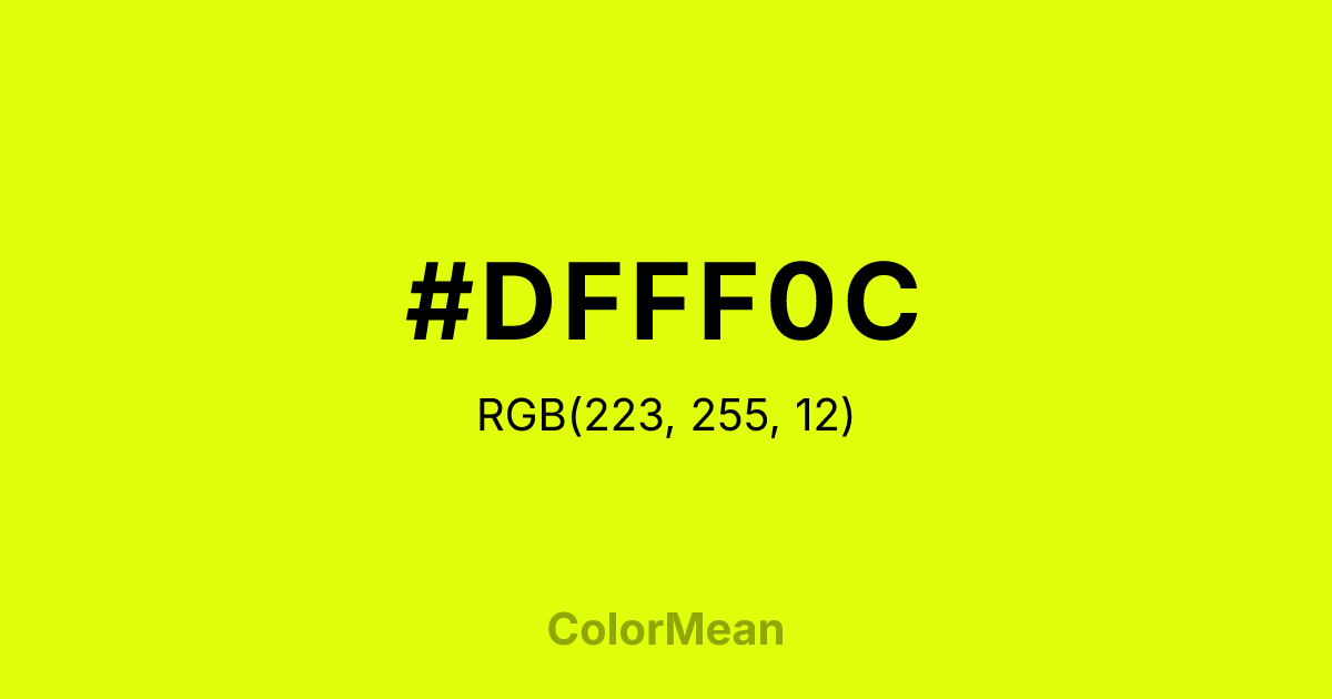 #DFFF0C RGB value is (223, 255, 12). The hex color red value is 223, green is 255, and blue is 12. Its HSL format shows a hue of 68°, saturation of 100 percent, and lightness of 52 percent. The CMYK process values are 13 percent, 0 percent, 95 percent, 0 percent.