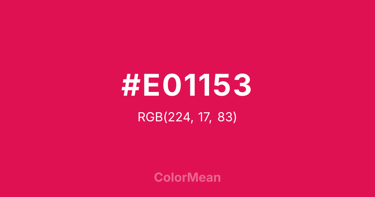 #E01153 RGB value is (224, 17, 83). The hex color red value is 224, green is 17, and blue is 83. Its HSL format shows a hue of 341°, saturation of 86 percent, and lightness of 47 percent. The CMYK process values are 0 percent, 92 percent, 63 percent, 12 percent.