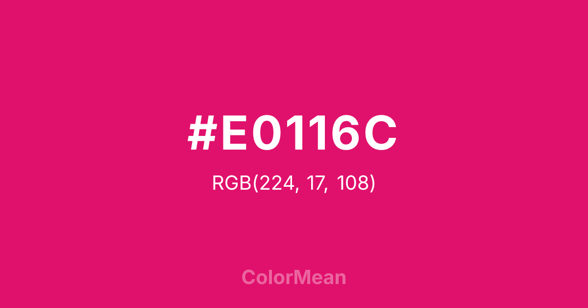 #E0116C RGB value is (224, 17, 108). The hex color red value is 224, green is 17, and blue is 108. Its HSL format shows a hue of 334°, saturation of 86 percent, and lightness of 47 percent. The CMYK process values are 0 percent, 92 percent, 52 percent, 12 percent.
