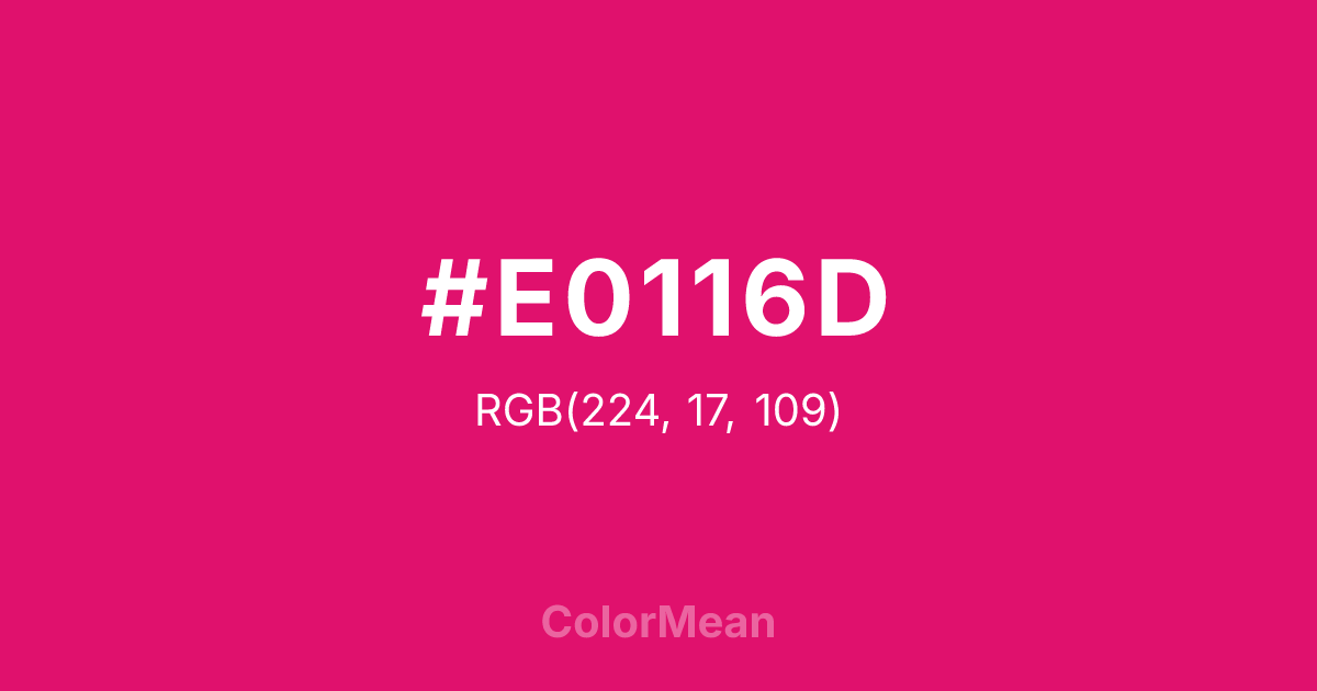 #E0116D RGB value is (224, 17, 109). The hex color red value is 224, green is 17, and blue is 109. Its HSL format shows a hue of 333°, saturation of 86 percent, and lightness of 47 percent. The CMYK process values are 0 percent, 92 percent, 51 percent, 12 percent.