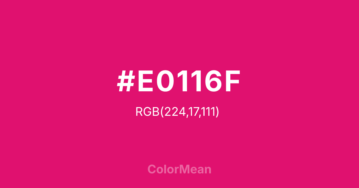 #E0116F RGB value is (224, 17, 111). The hex color red value is 224, green is 17, and blue is 111. Its HSL format shows a hue of 333°, saturation of 86 percent, and lightness of 47 percent. The CMYK process values are 0 percent, 92 percent, 50 percent, 12 percent.