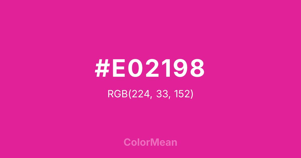 #E02198 RGB value is (224, 33, 152). The hex color red value is 224, green is 33, and blue is 152. Its HSL format shows a hue of 323°, saturation of 75 percent, and lightness of 50 percent. The CMYK process values are 0 percent, 85 percent, 32 percent, 12 percent.