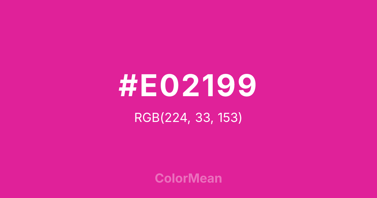 #E02199 RGB value is (224, 33, 153). The hex color red value is 224, green is 33, and blue is 153. Its HSL format shows a hue of 322°, saturation of 75 percent, and lightness of 50 percent. The CMYK process values are 0 percent, 85 percent, 32 percent, 12 percent.