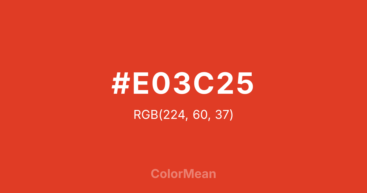 #E03C25 RGB value is (224, 60, 37). The hex color red value is 224, green is 60, and blue is 37. Its HSL format shows a hue of 7°, saturation of 75 percent, and lightness of 51 percent. The CMYK process values are 0 percent, 73 percent, 83 percent, 12 percent.