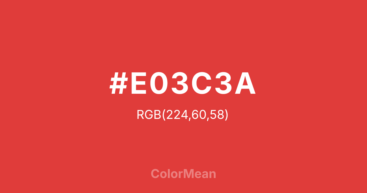 #E03C3A RGB value is (224, 60, 58). The hex color red value is 224, green is 60, and blue is 58. Its HSL format shows a hue of 1°, saturation of 73 percent, and lightness of 55 percent. The CMYK process values are 0 percent, 73 percent, 74 percent, 12 percent.