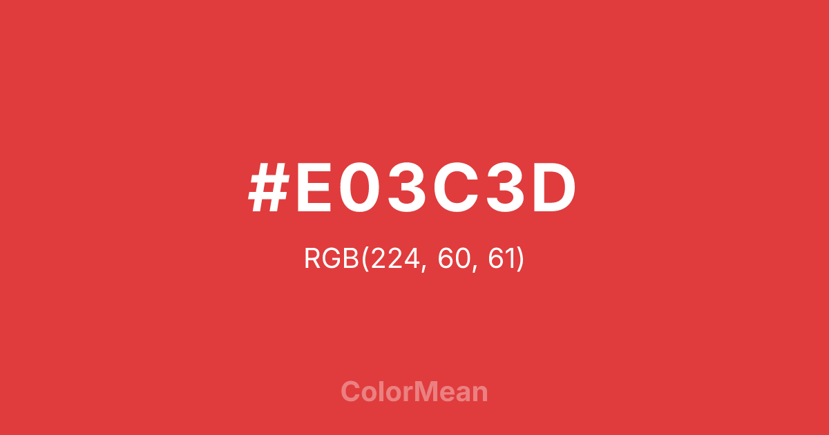 #E03C3D RGB value is (224, 60, 61). The hex color red value is 224, green is 60, and blue is 61. Its HSL format shows a hue of 360°, saturation of 73 percent, and lightness of 56 percent. The CMYK process values are 0 percent, 73 percent, 73 percent, 12 percent.