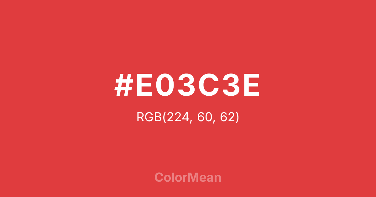 #E03C3E RGB value is (224, 60, 62). The hex color red value is 224, green is 60, and blue is 62. Its HSL format shows a hue of 359°, saturation of 73 percent, and lightness of 56 percent. The CMYK process values are 0 percent, 73 percent, 72 percent, 12 percent.