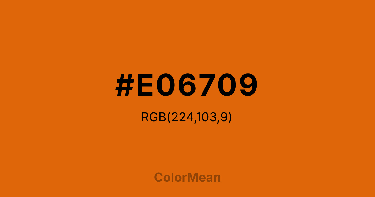#E06709 RGB value is (224, 103, 9). The hex color red value is 224, green is 103, and blue is 9. Its HSL format shows a hue of 26°, saturation of 92 percent, and lightness of 46 percent. The CMYK process values are 0 percent, 54 percent, 96 percent, 12 percent.