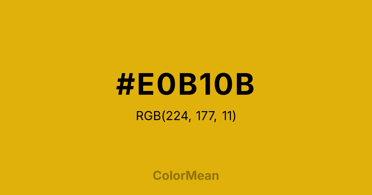 #E0B10B RGB value is (224, 177, 11). The hex color red value is 224, green is 177, and blue is 11. Its HSL format shows a hue of 47°, saturation of 91 percent, and lightness of 46 percent. The CMYK process values are 0 percent, 21 percent, 95 percent, 12 percent.