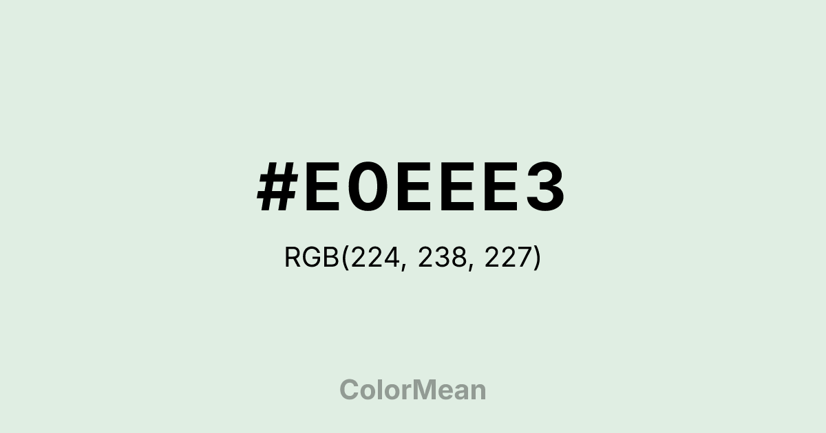 #E0EEE3 RGB value is (224, 238, 227). The hex color red value is 224, green is 238, and blue is 227. Its HSL format shows a hue of 133°, saturation of 29 percent, and lightness of 91 percent. The CMYK process values are 6 percent, 0 percent, 5 percent, 7 percent.