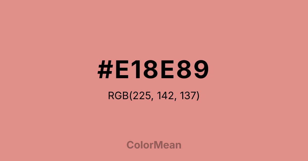 #E18E89 RGB value is (225, 142, 137). The hex color red value is 225, green is 142, and blue is 137. Its HSL format shows a hue of 3°, saturation of 59 percent, and lightness of 71 percent. The CMYK process values are 0 percent, 37 percent, 39 percent, 12 percent.