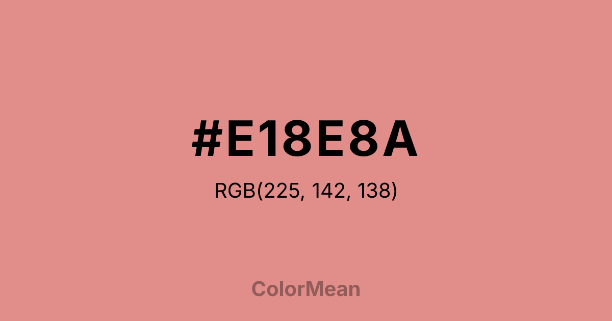 #E18E8A RGB value is (225, 142, 138). The hex color red value is 225, green is 142, and blue is 138. Its HSL format shows a hue of 3°, saturation of 59 percent, and lightness of 71 percent. The CMYK process values are 0 percent, 37 percent, 39 percent, 12 percent.