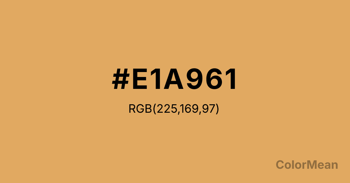 #E1A961 RGB value is (225, 169, 97). The hex color red value is 225, green is 169, and blue is 97. Its HSL format shows a hue of 34°, saturation of 68 percent, and lightness of 63 percent. The CMYK process values are 0 percent, 25 percent, 57 percent, 12 percent.