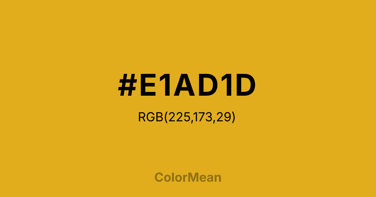 #E1AD1D RGB value is (225, 173, 29). The hex color red value is 225, green is 173, and blue is 29. Its HSL format shows a hue of 44°, saturation of 77 percent, and lightness of 50 percent. The CMYK process values are 0 percent, 23 percent, 87 percent, 12 percent.