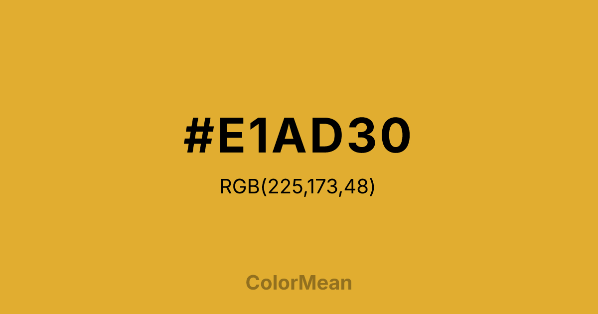 #E1AD30 RGB value is (225, 173, 48). The hex color red value is 225, green is 173, and blue is 48. Its HSL format shows a hue of 42°, saturation of 75 percent, and lightness of 54 percent. The CMYK process values are 0 percent, 23 percent, 79 percent, 12 percent.