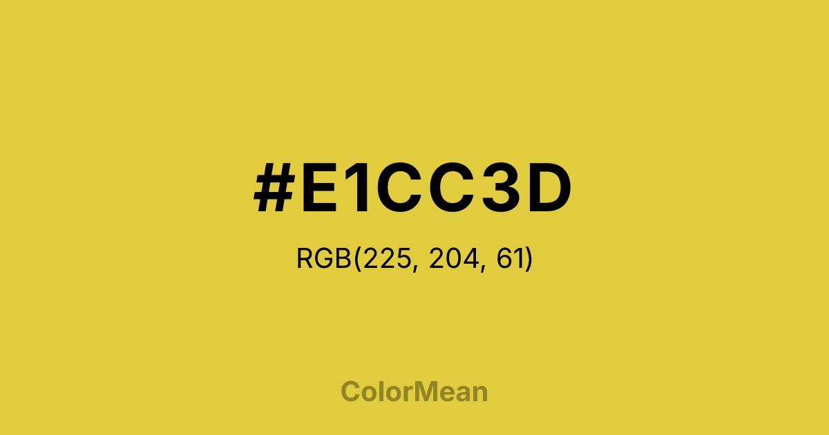 #E1CC3D RGB value is (225, 204, 61). The hex color red value is 225, green is 204, and blue is 61. Its HSL format shows a hue of 52°, saturation of 73 percent, and lightness of 56 percent. The CMYK process values are 0 percent, 9 percent, 73 percent, 12 percent.