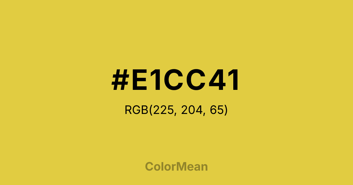 #E1CC41 RGB value is (225, 204, 65). The hex color red value is 225, green is 204, and blue is 65. Its HSL format shows a hue of 52°, saturation of 73 percent, and lightness of 57 percent. The CMYK process values are 0 percent, 9 percent, 71 percent, 12 percent.