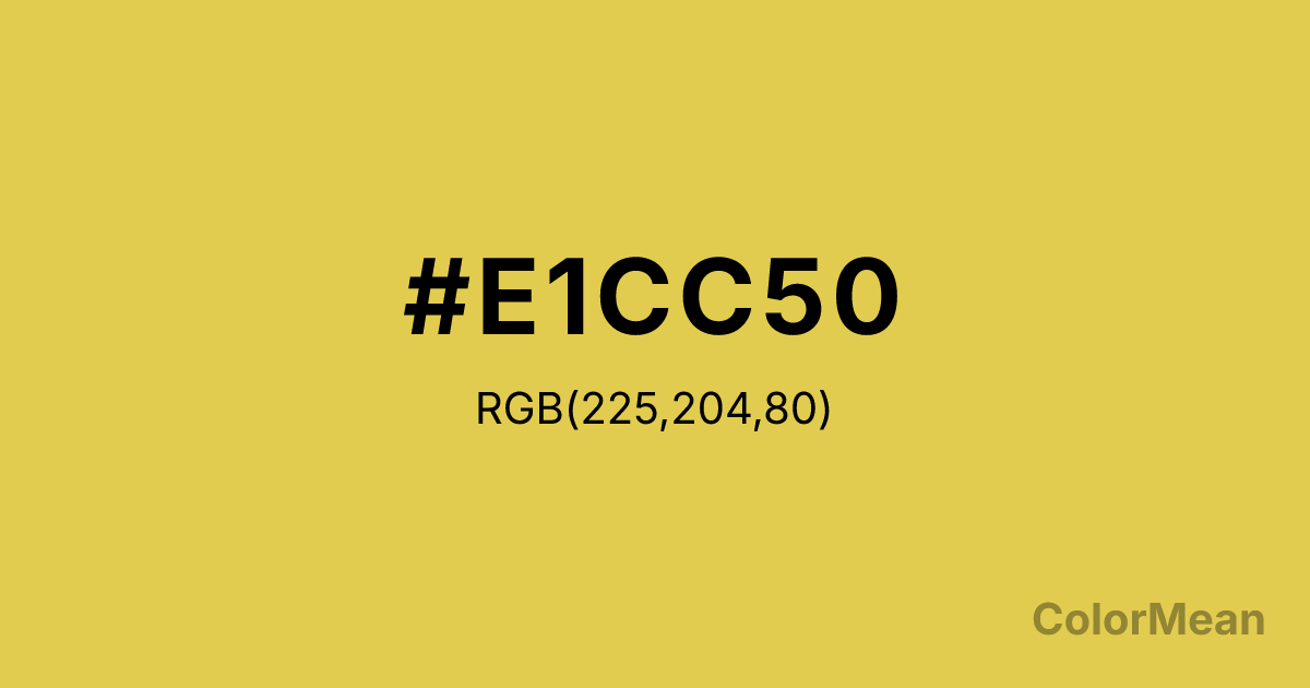 #E1CC50 RGB value is (225, 204, 80). The hex color red value is 225, green is 204, and blue is 80. Its HSL format shows a hue of 51°, saturation of 71 percent, and lightness of 60 percent. The CMYK process values are 0 percent, 9 percent, 64 percent, 12 percent.
