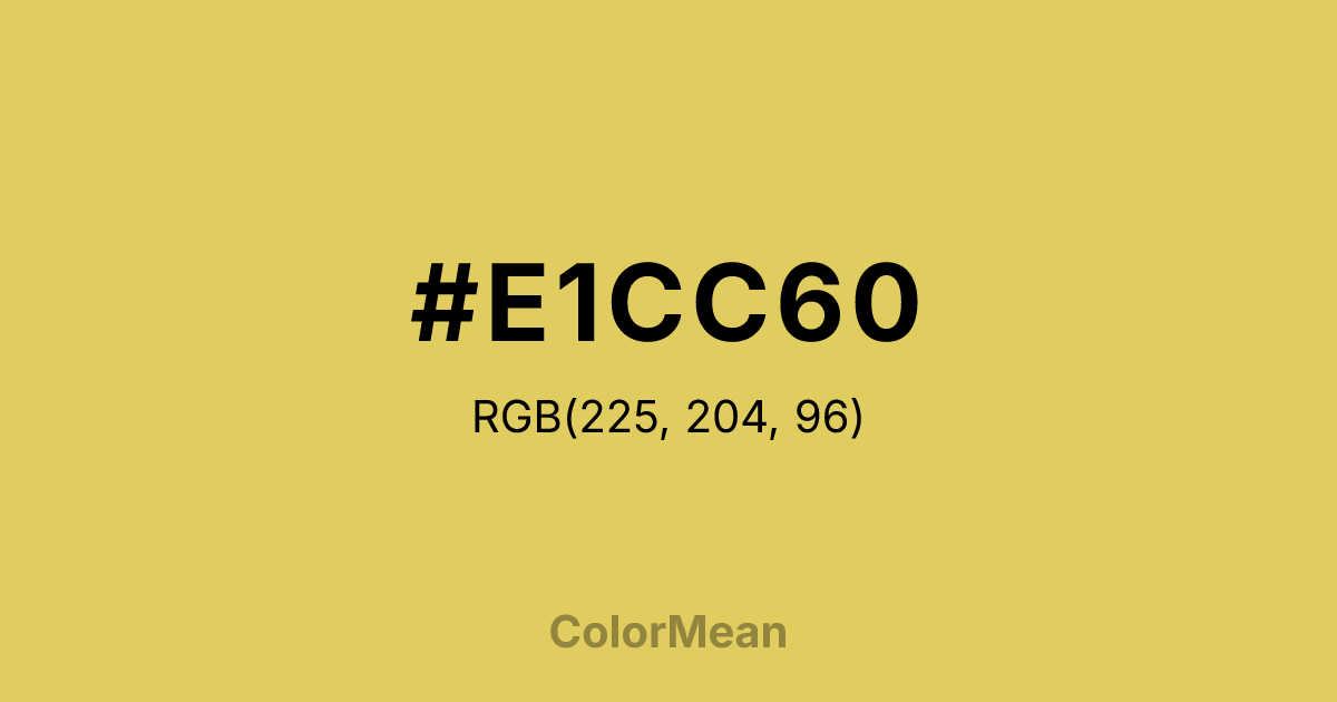 #E1CC60 RGB value is (225, 204, 96). The hex color red value is 225, green is 204, and blue is 96. Its HSL format shows a hue of 50°, saturation of 68 percent, and lightness of 63 percent. The CMYK process values are 0 percent, 9 percent, 57 percent, 12 percent.