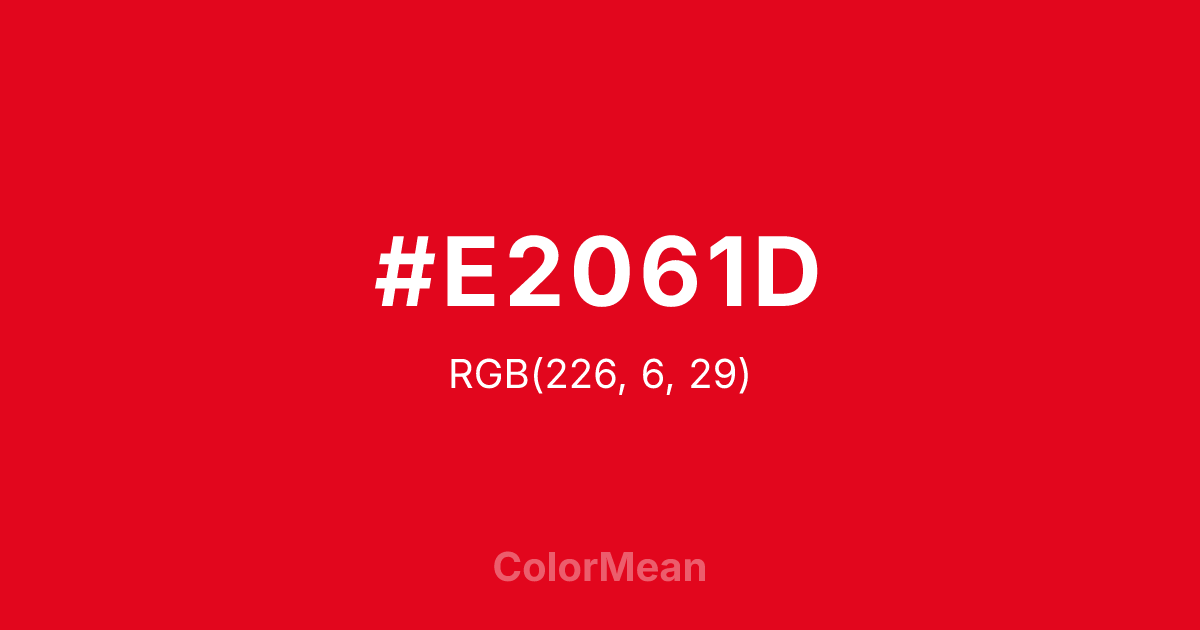 #E2061D RGB value is (226, 6, 29). The hex color red value is 226, green is 6, and blue is 29. Its HSL format shows a hue of 354°, saturation of 95 percent, and lightness of 45 percent. The CMYK process values are 0 percent, 97 percent, 87 percent, 11 percent.