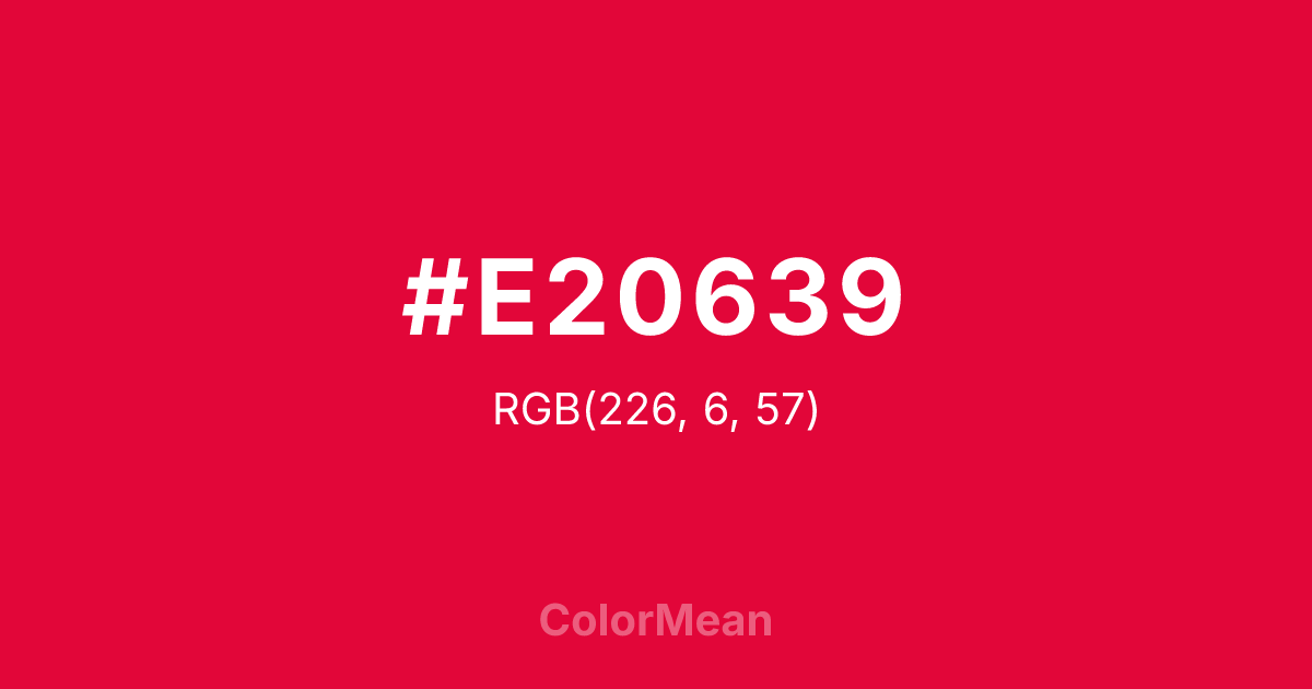 #E20639 RGB value is (226, 6, 57). The hex color red value is 226, green is 6, and blue is 57. Its HSL format shows a hue of 346°, saturation of 95 percent, and lightness of 45 percent. The CMYK process values are 0 percent, 97 percent, 75 percent, 11 percent.